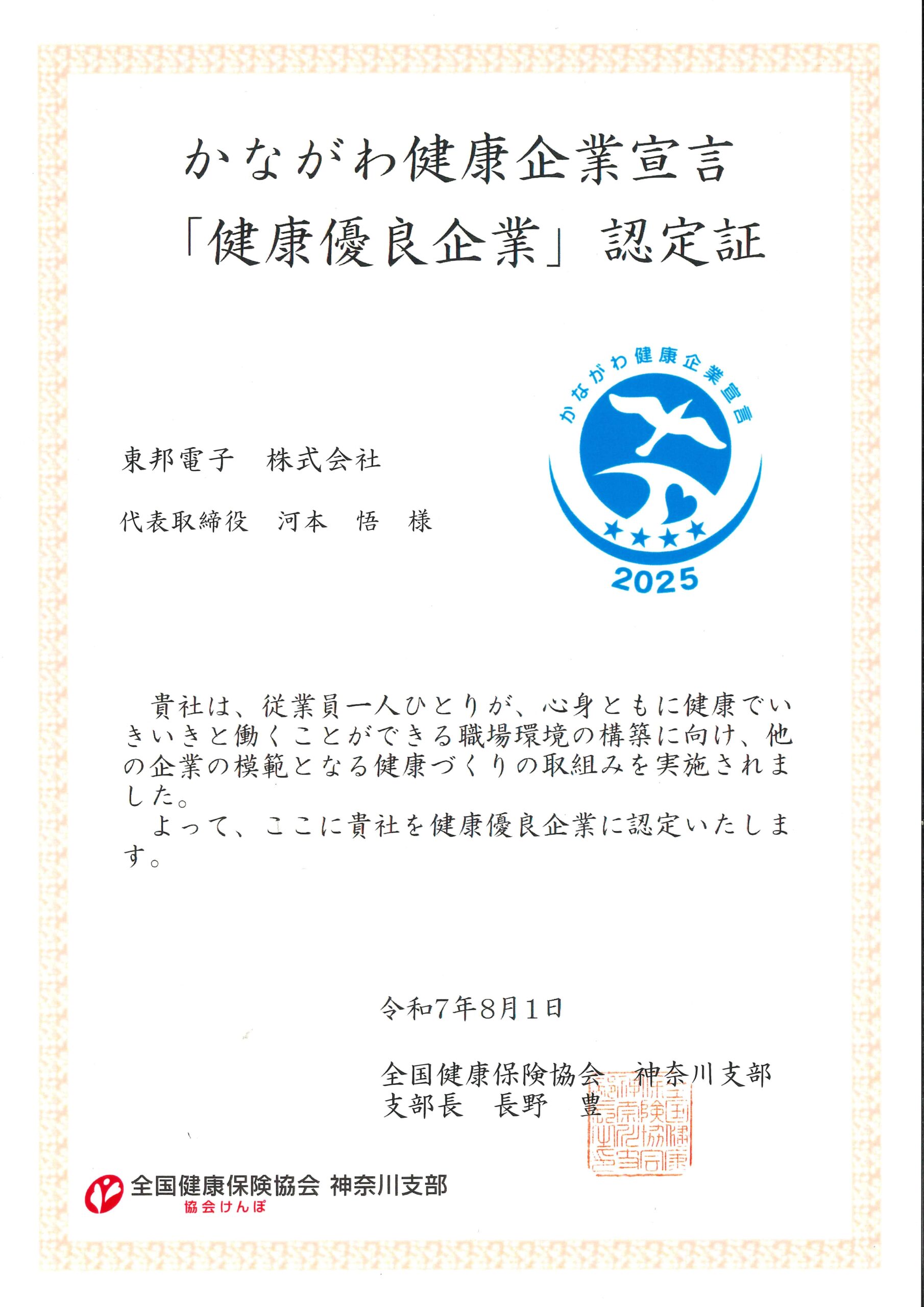 「健康優良企業」認定のお知らせ この度、東邦電子株式会社は全国健康保険協会 神奈川支部が推進している「かながわ健康企業宣言」に参画し、「健康優良企業」に認定されました。 「かながわ健康企業宣言」とは、協会けんぽ神奈川支部と企業が連携して従業員の健康づくりに取り組むことです。 当社はその取り組みの成果として★4の認定をいただきました。 これからも「顧客第一の精神」を大切に、従業員の健康増進やワークライフバランスの支援に努め、活力のある企業として社会への貢献を目指して参ります。